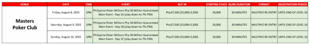 Following the north legs, the Masters Poker Club in Malate, Manila stages its Day 1 legs on August 8-10, 2025 with buy-in of ₱27,500.