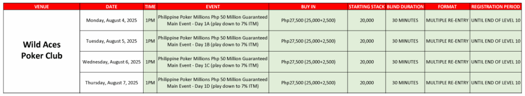 The north also got the ball rolling. Wild Aces in Pampanga kicked off its Day 1 leg on August 4 and runs until August 7. Buy-in is ₱27,500.
