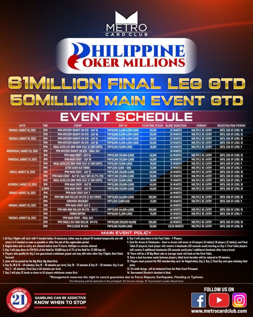 The Metro Card Club segment of the first-ever Philippine Poker Millions is about to hit the felt! For months, the spotlight has been on the flagship’s Day 1 flights, held at various poker rooms across the country and online via GGPoker PH. Now, the build-up is almost over. In just a few days, the action will converge under one roof, as the Metro officially kicks off the games on August 18.