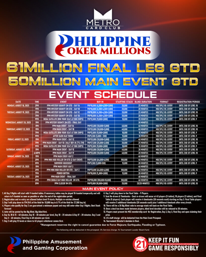 - ₱5 Million GTD Mini High Roller – ₱70,000 buy-in