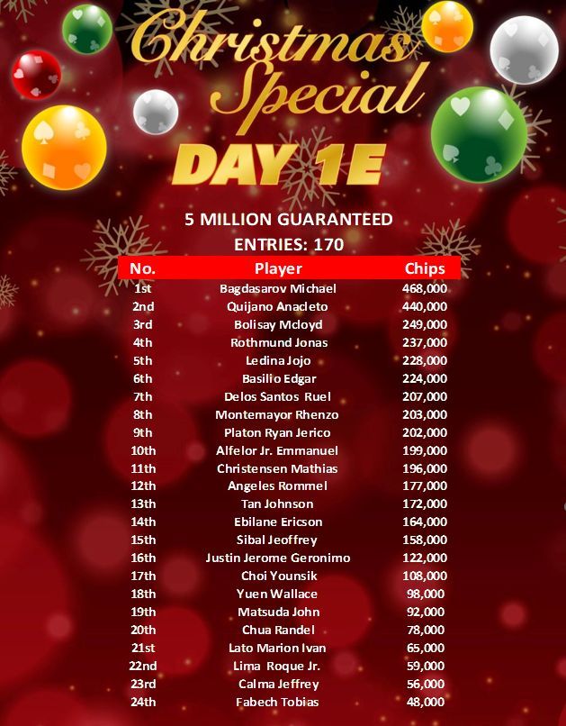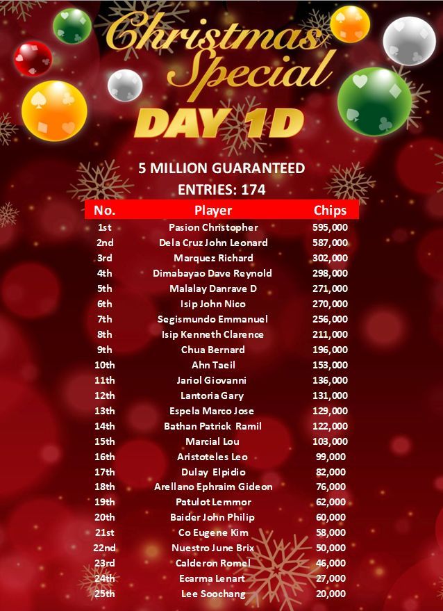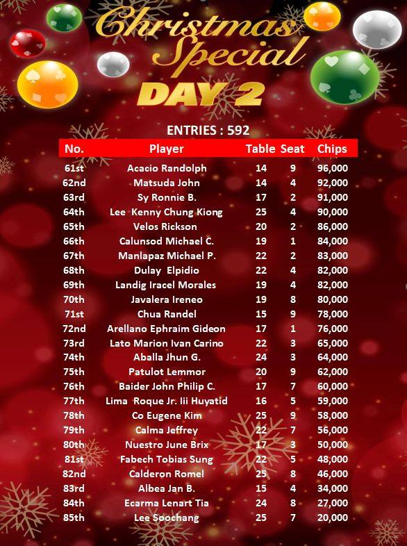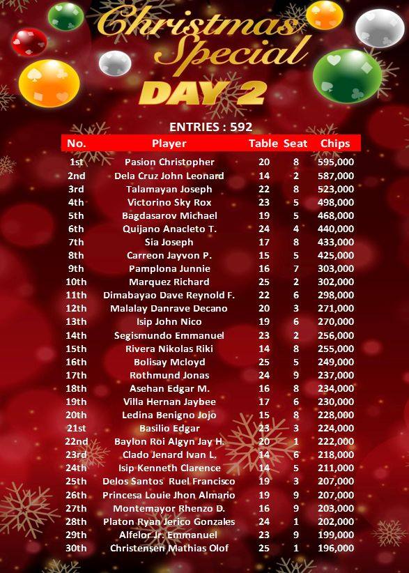 A total of 85 players will be returning to the Metro Card Club for today’s Day 2 heat which begins at 1Pm. Everyone has already locked up a min-cash of ₱20,000, but of course all eyes are firmly fixed on the seven figure ₱1,019,700 top prize, certain to be an early Christmas celebration for one lucky player.