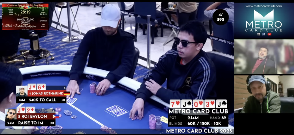 Change of leadership again when Baylon won a big pot after he raised with trips that got Rothmund to fold his trips (hand below). Metro commentators Jester Intia and Ron Regis were stunned by the fold, chalking it up to fatigue setting in.